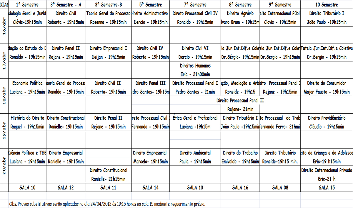 Horário de Avaliações do Curso de Direito