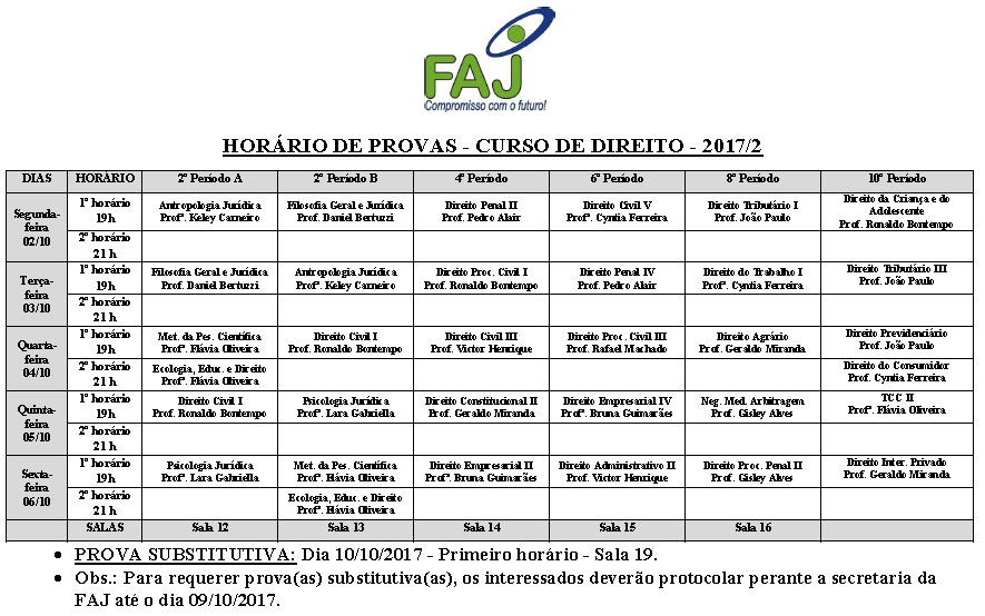 Horário de provas de Direito